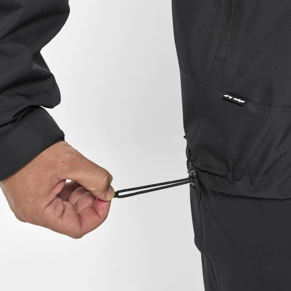 On retrouve en effet une capuche attenante, deux poches mains hautes zippées, des ventilations sous bras zippées, ainsi qu’un serrage aux poignets par patte velcros.