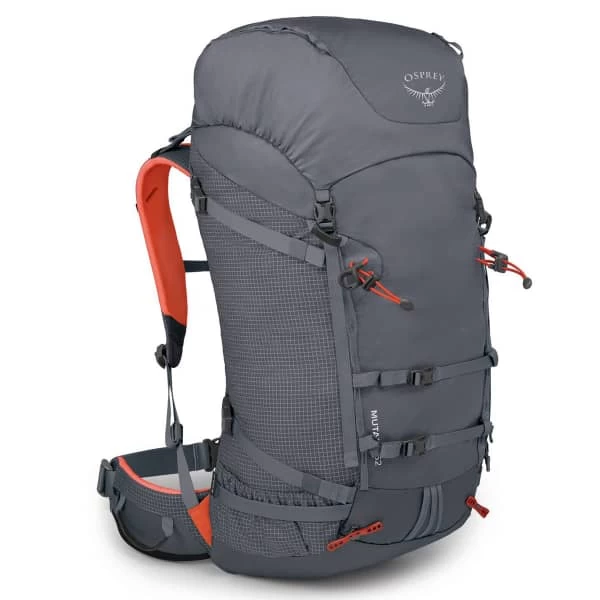 Côté portage, toutes les sangles pour le matériel sont amovibles, deux cordons élastiques complètent les portes piolets sur l’avant du sac. Il possède également des portes skis pour les fixer en triangle et un filet porte casque amovible multi-positions. Sans oublier le porte-corde et les sangles de compression afin de maintenir la charge stable. Osprey améliore encore ce modèle et réussi le pari de le rendre encore plus léger tout en restant extrêmement résistants.