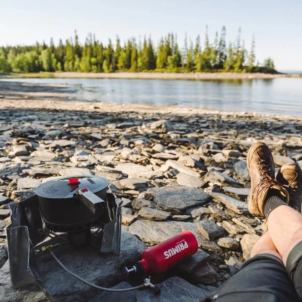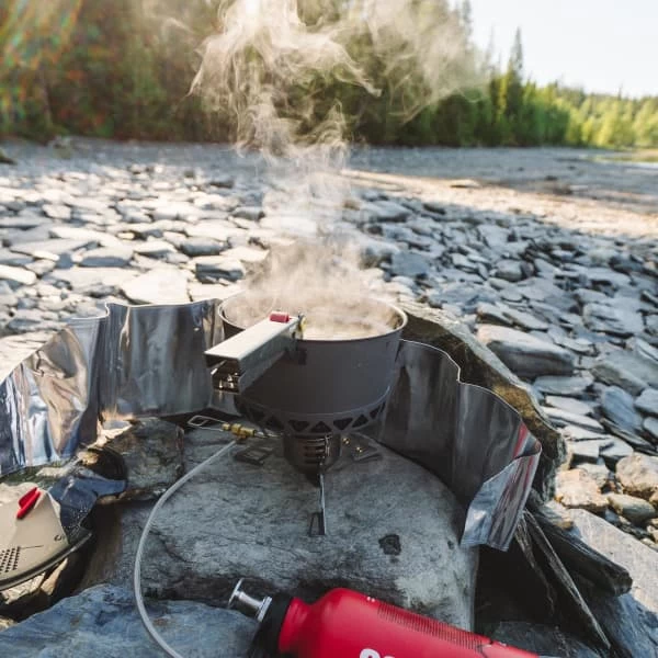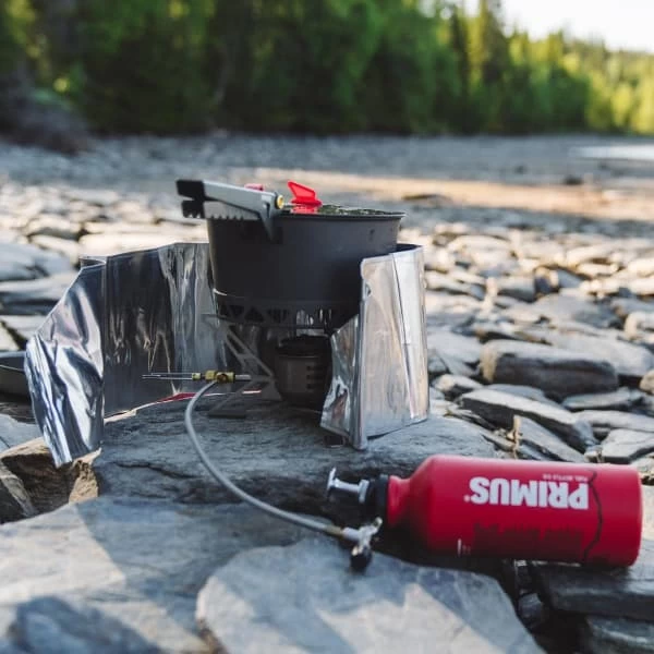 Le réflecteur WINDSCREEN AND HEAT REFLECTOR SET de PRIMUS concentre la chaleur sur la marmite.